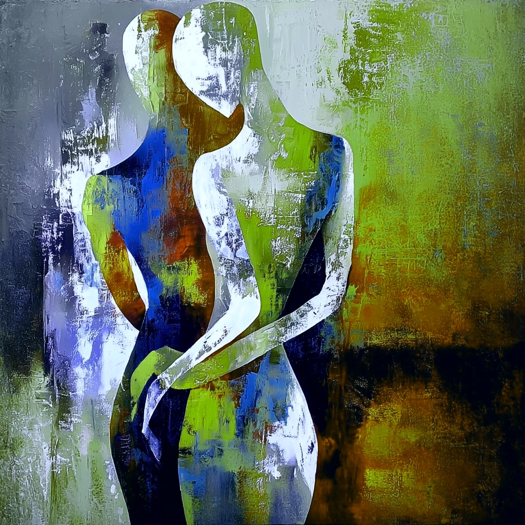 A fusion of abstract expressionism and human form, an oil painting speaking through colour and gesture rather than features – a tribute to the grace and mystery of humanoid form.