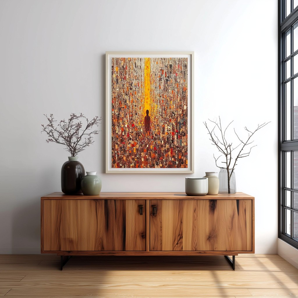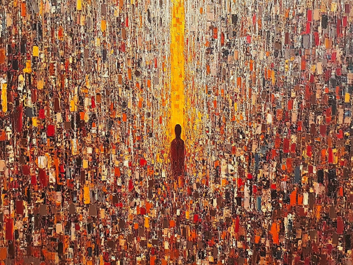 A solitary calm figure stands in a mosaic crowd, drawn to a golden vertical beam.