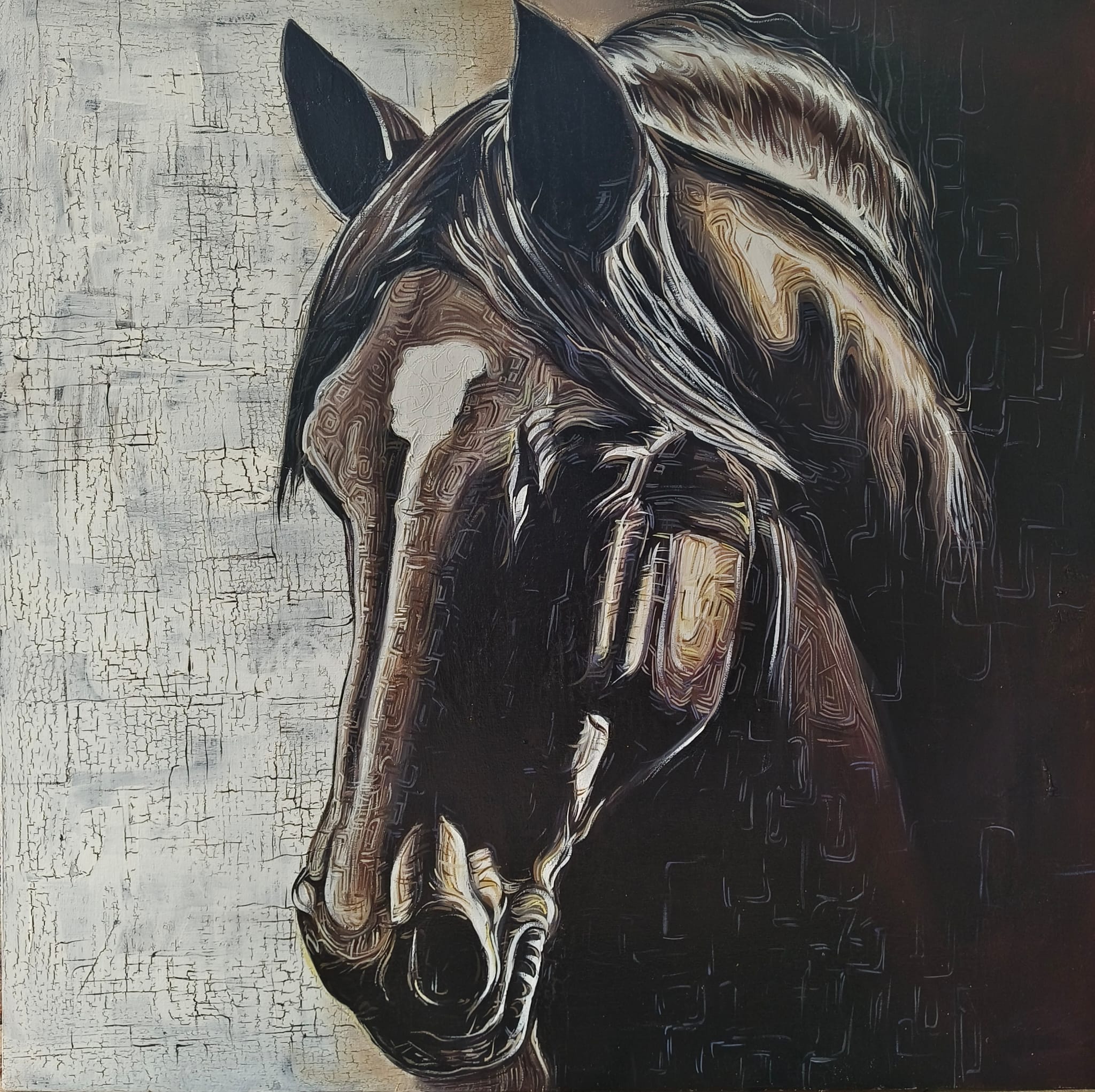 Creative technique with oil on canvas and intricate brushwork to bring out the calm beauty of the black horse