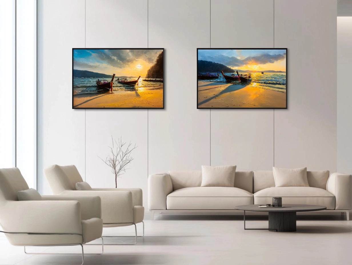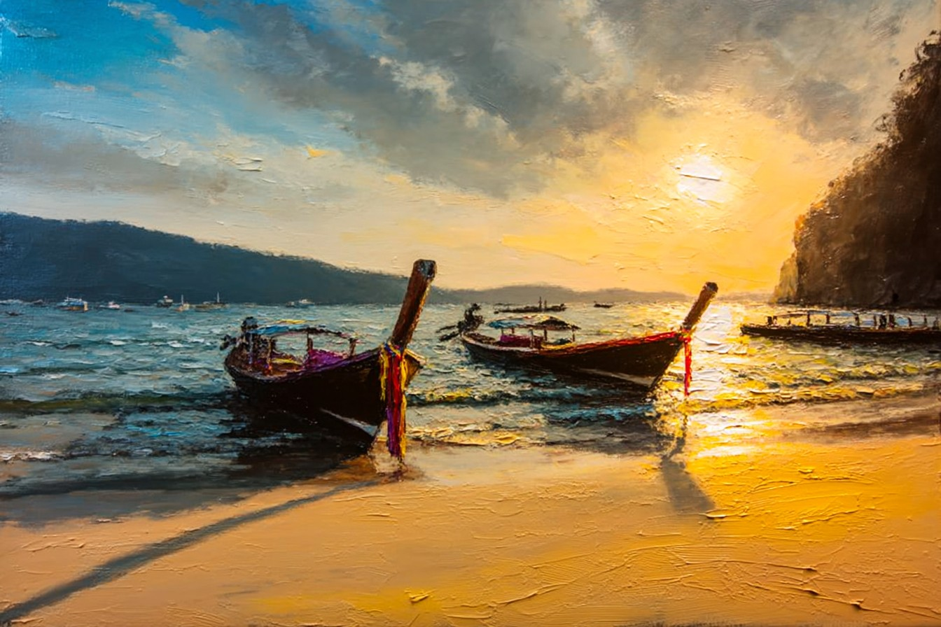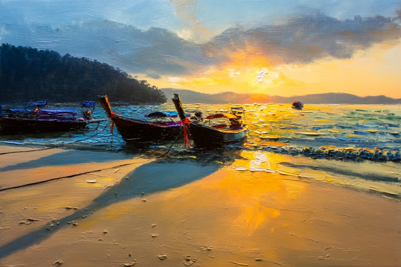 Longtail boats drift in the shimmering sunset, casting soft reflections across a golden beach and calm sea.