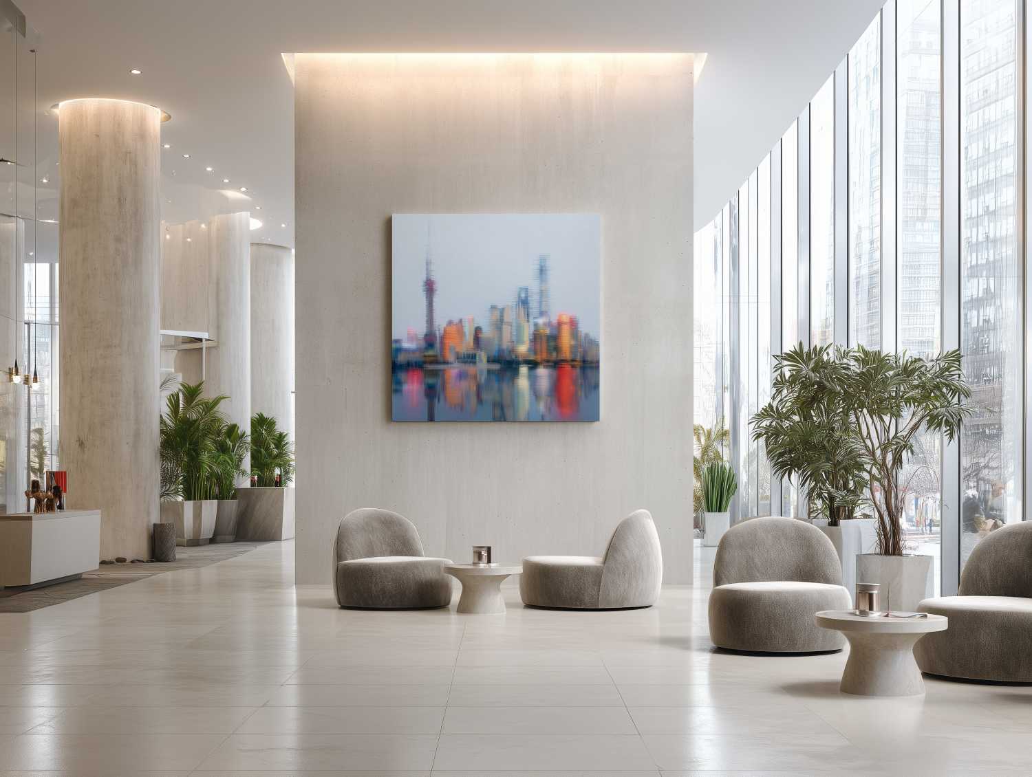 An abstract crowd flows through shimmering streets, capturing the rhythm and glow of a modern, rain-drenched metropolis.