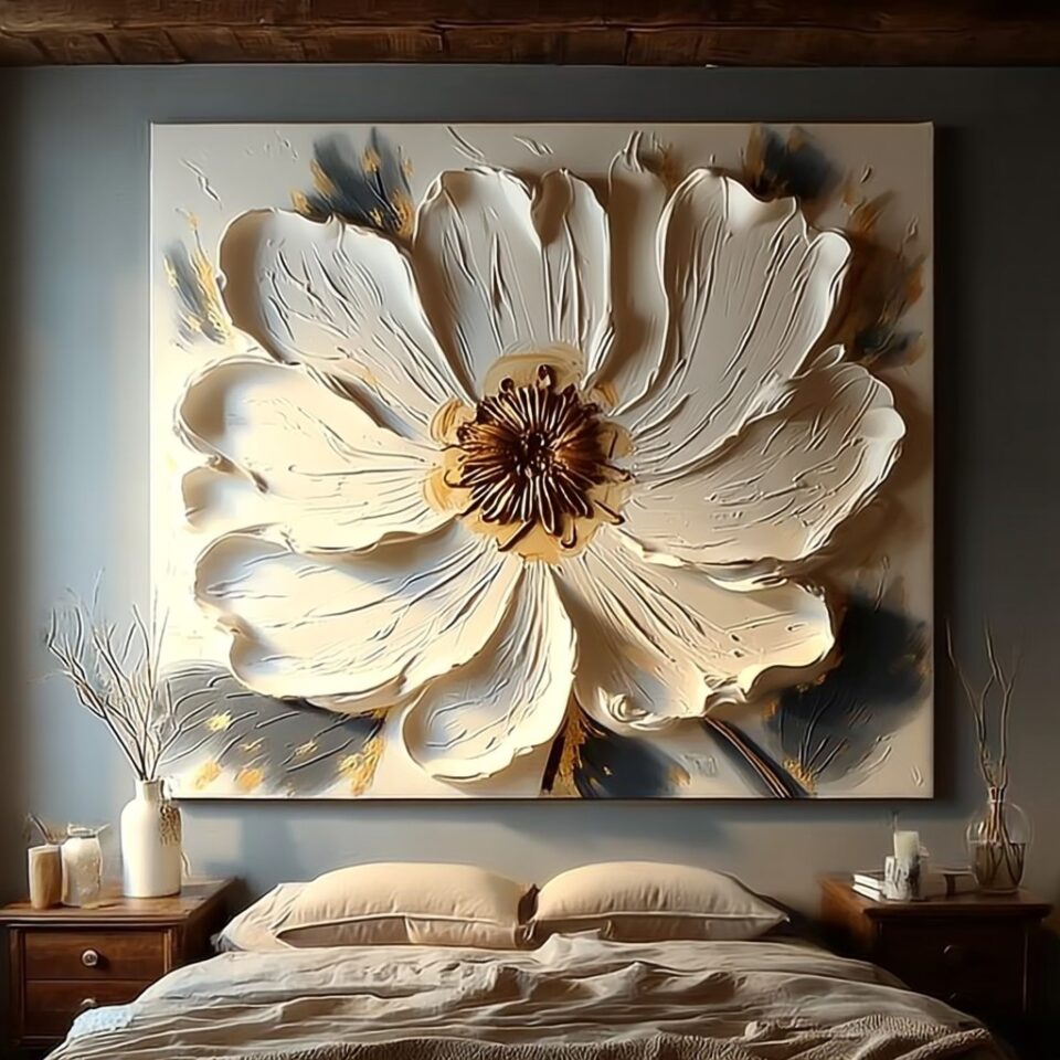 A quiet meadow of modern florals blooming in textured elegance, with petals sculpted against soft grey, dimensional, and graceful in a dance of white and gold.
